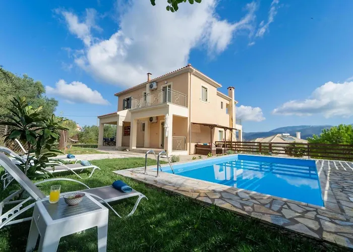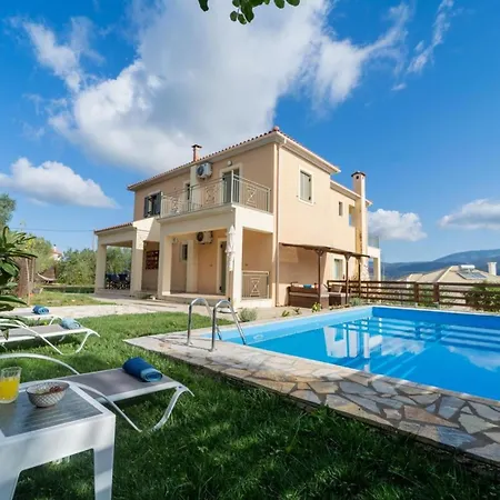 リラックスできるプライベートなプールを提供する寝室3室のBelle Helens Villa, Lakithra アルゴストリオンは、キャッスル オブ アギオス ゲオルギオスから車で10分以内に位置しています。 メモリアル アックイ ディヴィシオンから7キロメートル以内の場所にあるこの浴室3室の別荘では、テラスを利用することができます。